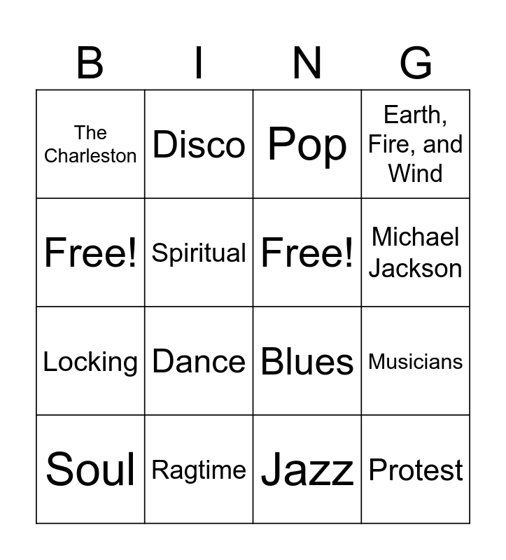 This bingo card has 16 words: Ragtime, Musicians, Pop, The Charleston, Locking, Disco, Blues, Jazz, Free!, Spiritual, Soul, Earth, Fire, and Wind, Dance, Michael Jackson, Free! and Protest.