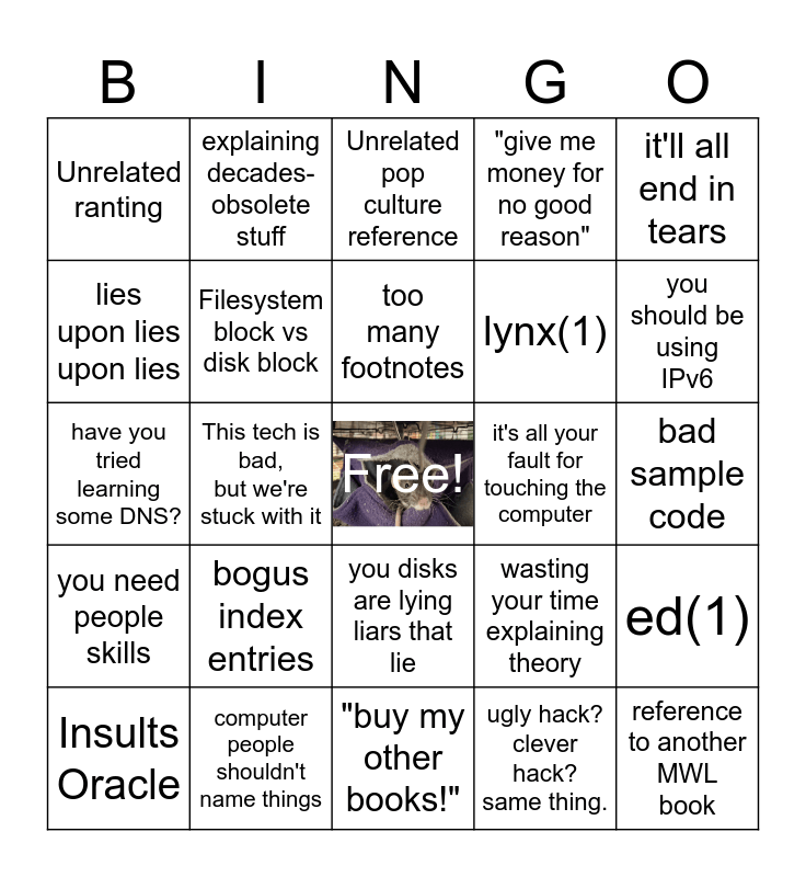 This bingo card has a free space and 29 words: Insults Oracle, Computers were a mistake, This tech is bad, but we're stuck with it, Unnecessary Description, Unrelated ranting, Unrelated pop culture reference, Filesystem block vs disk block, bogus index entries, it's all your fault for touching the computer, computer people shouldn't name things, bad sample code, reference to another MWL book, "buy my other books!", ugly hack? clever hack? same thing., you should be using IPv6, network flow data, you disks are lying liars that lie, you need people skills, it'll all end in tears, have you tried learning some DNS?, wasting your time explaining theory, reference to a MWL non-tech book, lynx(1), lies upon lies upon lies, "give me money for no good reason", explaining decades-obsolete stuff, ed(1), too many footnotes and explaining a feature you shouldn't use.