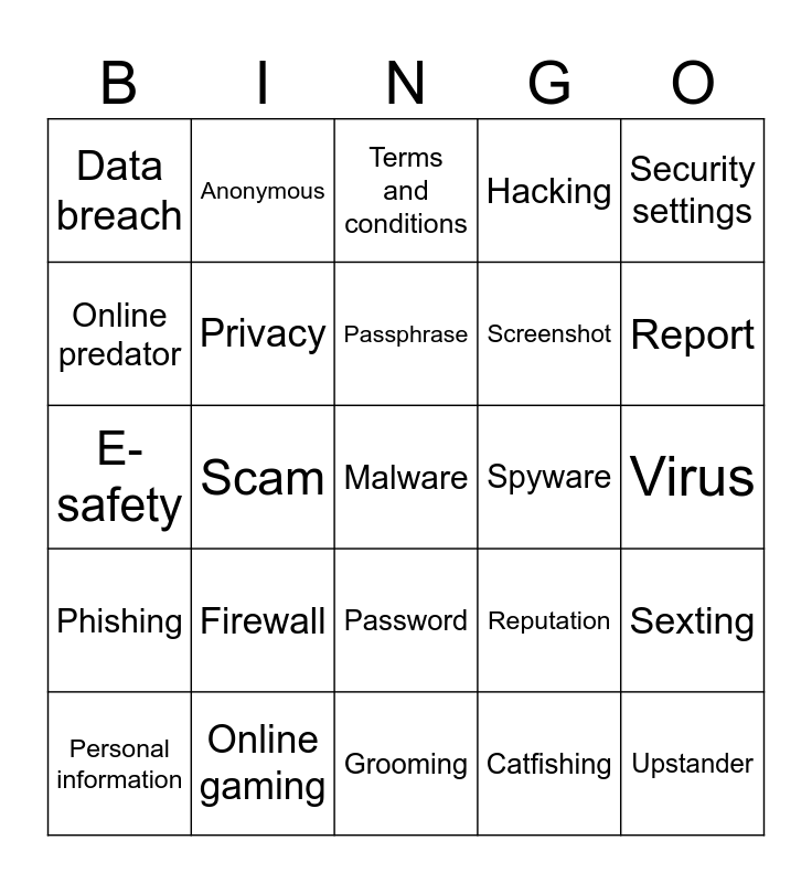 This bingo card has 39 words: Cyberbullying, Digital footprint, Online identity, Privacy, Personal information, Password, Passphrase, Two-factor authentication, Security settings, Phishing, Scam, Hacking, Malware, Virus, Spyware, Firewall, Encryption, Data breach, Consent, Reputation, Online predator, Grooming, Screenshot, Report, Block, Bystander, Upstander, Social media, Username, Anonymous, Location sharing, Digital citizenship, Terms and conditions, Online gaming, Catfishing, Fake account, Sexting, E-safety and Cybercrime.
