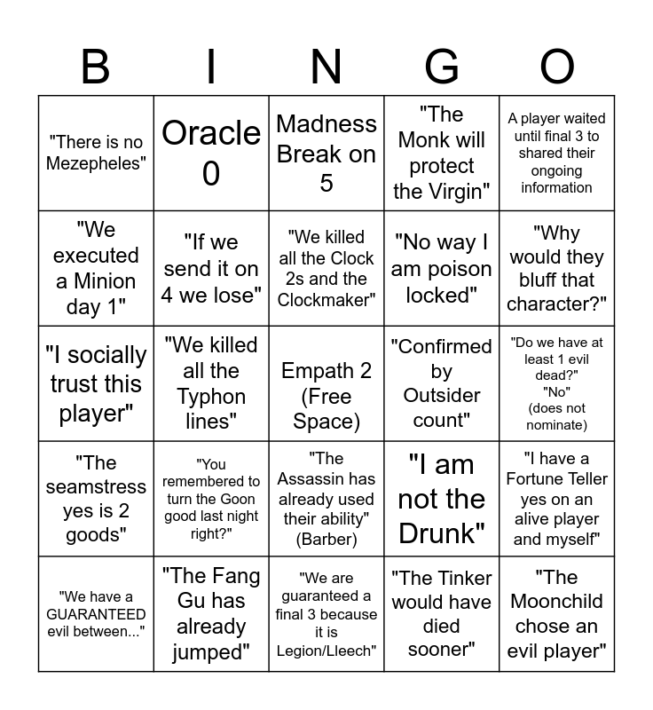This bingo card has a free space and 24 words: "You remembered to turn the Goon good last night right?", "The Fang Gu has already jumped", "We killed all the Clock 2s and the Clockmaker", "We have a GUARANTEED evil between...", A player waited until final 3 to shared their ongoing information, "There is no Mezepheles", "We executed a Minion day 1", Oracle 0, "Confirmed by Outsider count", "The Assassin has already used their ability" (Barber), "No way I am poison locked", "I socially trust this player", "I am not the Drunk", "I have a Fortune Teller yes on an alive player and myself", "If we send it on 4 we lose", "The Tinker would have died sooner", "Do we have at least 1 evil dead?" "No" (does not nominate), Madness Break on 5, "Why would they bluff that character?", "We killed all the Typhon lines", "The Moonchild chose an evil player", "The seamstress yes is 2 goods", "The Monk will protect the Virgin" and "We are guaranteed a final 3 because it is Legion/Lleech".