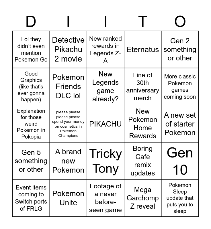 This bingo card has a free space and 24 words: A brand new Pokemon, Pokemon Unite, New Legends game already?, Event items coming to Switch ports of FRLG, Gen 2 something or other, Lol they didn’t even mention Pokemon Go, Good Graphics (like that's ever gonna happen), Detective Pikachu 2 movie, New Pokemon Home Rewards, Tricky Tony, Line of 30th anniversary merch, Explanation for those weird Pokemon in Pokopia, Boring Cafe remix updates, Gen 10, Pokemon Friends DLC lol, Mega Garchomp Z reveal, A new set of starter Pokemon, New ranked rewards in Legends Z-A, More classic Pokemon games coming soon, please please please please spend your money on cosmetics in Pokemon Champions, Pokemon Sleep update that puts you to sleep, Gen 5 something or other, Eternatus and Footage of a never before-seen game.