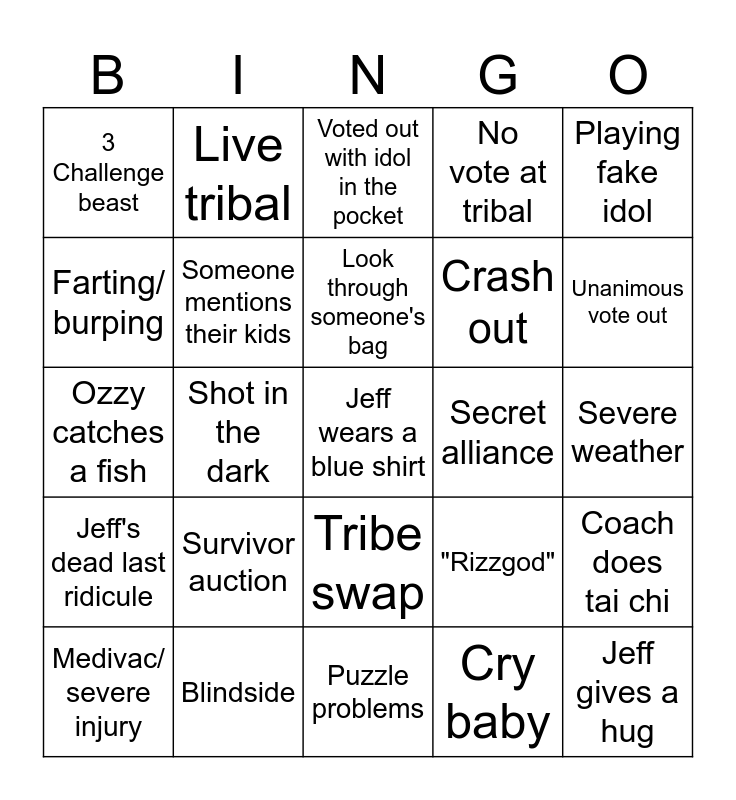 This bingo card has a free space and 24 words: Survivor auction, Blindside, Look through someone's bag, Medivac/ severe injury, Playing fake idol, 3 Challenge beast, Farting/ burping, Live tribal, Secret alliance, Tribe swap, Crash out, Ozzy catches a fish, "Rizzgod", Coach does tai chi, Someone mentions their kids, Cry baby, Severe weather, Voted out with idol in the pocket, Unanimous vote out, Shot in the dark, Jeff gives a hug, Jeff's dead last ridicule, No vote at tribal and Puzzle problems.