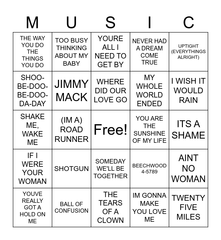 This bingo card has a free space and 60 words: AINT THAT PECULIAR, BALL OF CONFUSION, I HEARD IT THROUGH THE GRAPEVINE, IF I WERE YOUR WOMAN, IM GONNA MAKE YOU LOVE ME, IVE GOT TO USE MY IMAGINATION, JIMMY MACK, MY GUY, MY WHOLE WORLD ENDED, NEEDLE IN A HAYSTASCK, NEVER HAD A DREAM COME TRUE, REACH OUT ILL BE THERE, SHOO-BE-DOO-BE-DOO-DA-DAY, SHOP AROUND, THE LOVE YOU SAVE, THE WAY YOU DO THE THINGS YOU DO, TWENTY FIVE MILES, UPTIGHT (EVERYTHINGS ALRIGHT), WHATS GOING ON, WHERE DID OUR LOVE GO, YOU ARE THE SUNSHINE OF MY LIFE, YOURE ALL I NEED TO GET BY, YOUVE REALLY GOT A HOLD ON ME, AINT NO WOMAN, SIR DUKE, WALK AWAY RENEE, I CANT HELP MYSELF, THE TRACKS OF MY TEARS, I WISH IT WOULD RAIN, MY GIRL, RIVER DEEP, MOUNTAIN HIGH, FINGERTIPS PT2, MY CHERIE AMOUR, PRIDE AND JOY, TOO BUSY THINKING ABOUT MY BABY, COME SEE ABOUT ME, RESCUE ME, (IM A) ROAD RUNNER, PLEASE MR.POSTMAN, SHAKE ME, WAKE ME, BEAUTY IS ONLY SKIN DEEP, SHOTGUN, ITS A SHAME, TAKE ME IN YOUR ARMS AND LOVE ME, BEECHWOOD 4-5789, QUICKSAND, YOU BEAT ME TO THE PUNCH, WHAT DOES IT TAKE, THIS OLD HEART OF MINE, SOMEDAY WE'LL BE TOGETHER, THE TEARS OF A CLOWN, YOU HAVENT DONE NOTHIN, THE ONE WHO REALLY LOVES YOU, GOING TO A GO-GO, I WISH, ISNT SHE LOVELY, WHOS MAKING LOVE, DONT WORRY BOUT A THING, KEEPER OF THE CASTLE and MERCY MERCY ME.