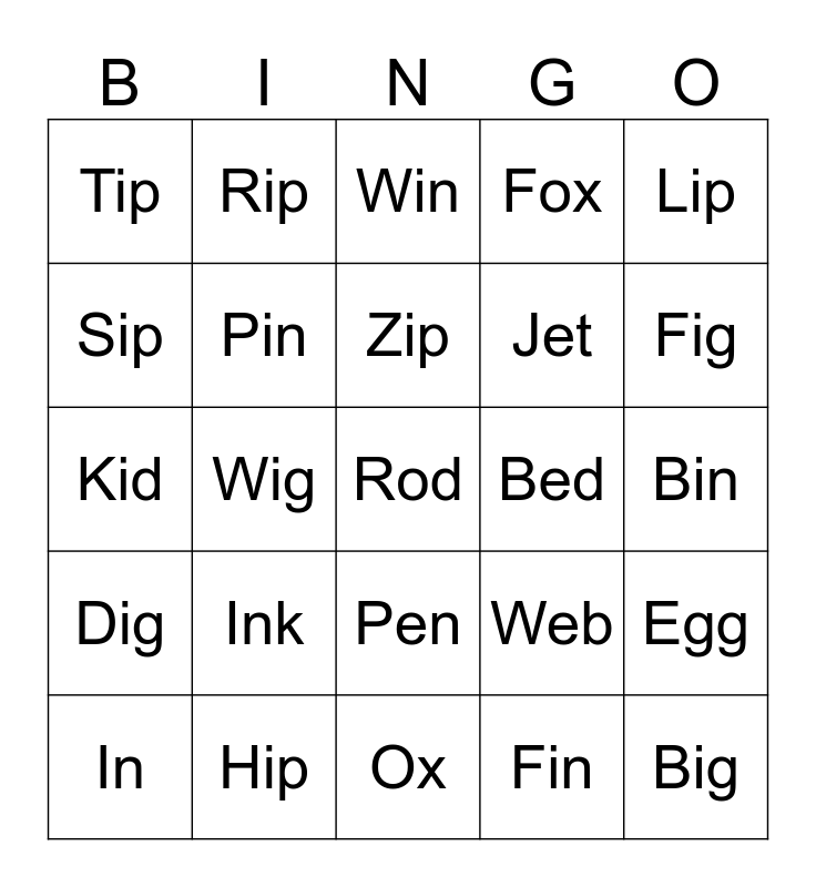 This bingo card has a free space and 24 words: Ink, Hip, Zip, In, Lip, Tip, Sip, Rip, Bed, Pen, Jet, Kid, Web, Egg, Pin, Fin, Bin, Win, Fig, Wig, Big, Dig, Fox and Ox.