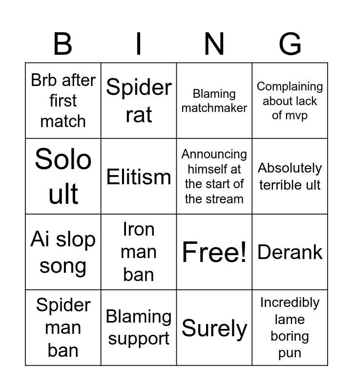 This bingo card has 21 words: Blaming support, Demanding iron man buffs, Spider rat, Boring, Surely, Announcing himself at the start of the stream, Brb after first match, Blaming matchmaker, Free!, Absolutely terrible ult, Ai slop song, Complaining about lack of mvp, Incredibly lame boring pun, Any sort of halo mention, Elitism, Derank, Spider man ban, Iron man ban, Solo ult, Derank and Rank up.