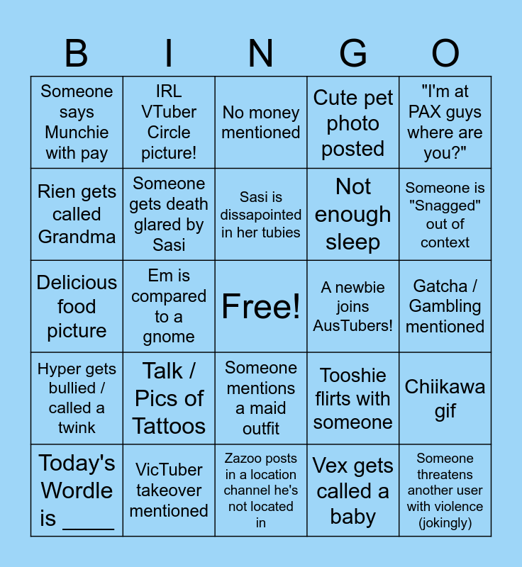 This bingo card has a free space and 24 words: Talk / Pics of Tattoos, VicTuber takeover mentioned, Sasi is dissapointed in her tubies, Today's Wordle is ____, "I'm at PAX guys where are you?", Someone says Munchie with pay, Rien gets called Grandma, IRL VTuber Circle picture!, A newbie joins AusTubers!, Someone mentions a maid outfit, Not enough sleep, Delicious food picture, Tooshie flirts with someone, Chiikawa gif, Someone gets death glared by Sasi, Vex gets called a baby, Gatcha / Gambling mentioned, No money mentioned, Someone is "Snagged" out of context, Em is compared to a gnome, Someone threatens another user with violence (jokingly), Hyper gets bullied / called a twink, Cute pet photo posted and Zazoo posts in a location channel he's not located in.
