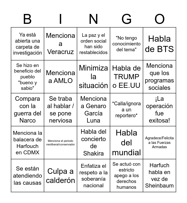 This bingo card has a free space and 24 words: Menciona el periodo neoliberal/conservador, Culpa a calderón, Minimiza la situación, Se están atendiendo las causas, Habla de BTS, Ya está abierta una carpeta de investigación, Se hizo en beneficio del pueblo "bueno y sabio", Menciona a Veracruz, *Calla/ignora a un reportero*, Habla del concierto de Shakira, Habla de TRUMP o EE.UU, Compara con la guerra del Narco, Habla del mundial, Agradece/Felicita a las Fuerzas Armadas, Menciona a AMLO, Se actuó con estricto apego a los derechos humanos, ¡La operación fue exitosa!, La paz y el orden social han sido restablecidos, Menciona que los programas sociales, Se traba al hablar / se pone nerviosa, Harfuch habla en vez de Sheinbaum, Menciona la balacera de Harfouch en CDMX, "No tengo conocimiento del tema" and Enfatiza el respeto a la soberanía nacional.