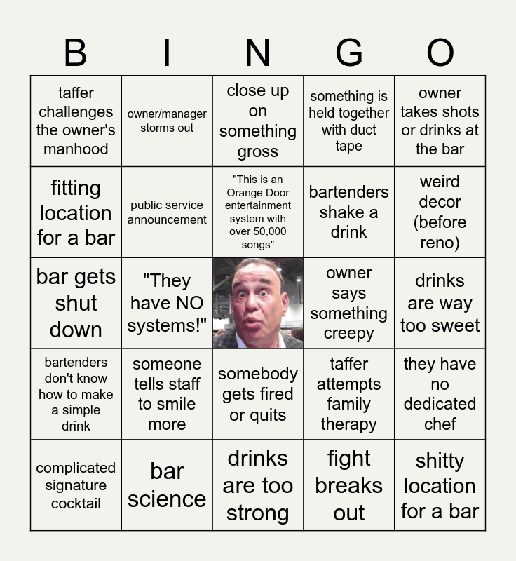 This bingo card has a free space and 63 words: "YOU'RE GONNA KILL SOMEBODY!!!", bar owner is about to lose their house, somebody in the bar starts stripping, they have no dedicated chef, bar name gets changed to something sentimental, bar name gets changed to something related to the location, owner/manager storms out, one person finally steps up during the stress test, "This is an Orange Door entertainment system with over 50,000 songs", bar has some weird, alienating gimmick, somebody gets fired or quits, "If I was a single woman, I would not come in here", drinks are way too sweet, owner takes shots or drinks at the bar, bacteria counter thingy is used, fitting location for a bar, "They have NO systems!", taffer challenges the owner's manhood, walk-ins are a disaster, bartenders shake a drink, someone tells staff to smile more, bartenders don't know how to make a simple drink, something is held together with duct tape, somebody hits on the recon spy, someone gets fired, no bar experience, taffer throws something, owner/manager is problem drinker, raw food gets served, fryer is dirty, mold, taffer says “fricken”, debt over 200k, table gets wrong order, weird decor (before reno), complicated signature cocktail, taffer walks out, fight breaks out, cool scanning effects, public service announcement, bar gets shut down, owner says something creepy, food not stored properly, weird decor (after reno), shitty location for a bar, bar science, somebody cries, taffer attempts family therapy, too many menu items, workplace harassment, microwaved food, drinks are too strong, new bar name sucks, clearly corporate redesign, taffer mentions "youth", close up on something gross, taffer’s new idea for the bar is dumb, mixologist's new drinks are nasty, mixologist's new drinks are yummy, taffer screams so hard his face turns red, blatant misogyny, taffer says something creepy and cross contamination.
