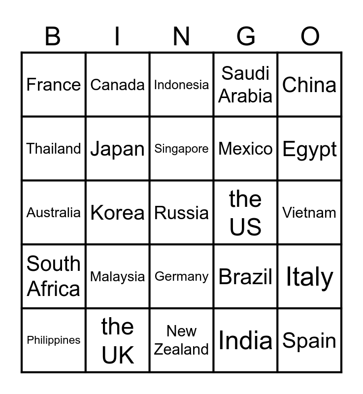 This bingo card has 25 words: Malaysia, New Zealand, Singapore, Philippines, China, France, Thailand, Canada, the US, Germany, Mexico, Australia, Brazil, Italy, Japan, Spain, Vietnam, Indonesia, Egypt, Korea, Russia, the UK, South Africa, Saudi Arabia and India.