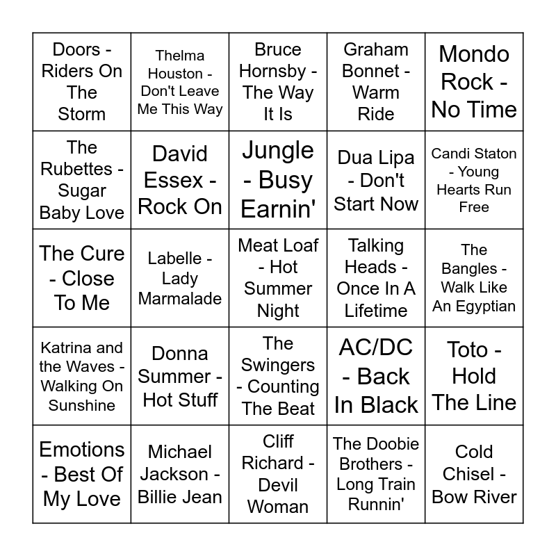 This bingo card has 46 words: Michael Jackson - Don't Stop 'Til You Get Enough, Meat Loaf - Hot Summer Night, Bee Gees - How Deep Is Your Love, Cliff Richard - Devil Woman, Donna Summer - Hot Stuff, Barry Blue - Dancin' On A Saturday Night, Thelma Houston - Don't Leave Me This Way, 10cc - Rubber Bullets, The Rubettes - Sugar Baby Love, Pilot - January, David Essex - Rock On, Graham Bonnet - Warm Ride, Toto - Hold The Line, AC/DC - Back In Black, AC/DC - You Shook Me All Night Long, The Police - Every Breath You Take, Jungle - Busy Earnin', Talking Heads - Once In A Lifetime, Courtney Barnett - Elevator Operator, Mondo Rock - No Time, Labelle - Lady Marmalade, The Doobie Brothers - Long Train Runnin', Doors - Riders On The Storm, Dua Lipa - Don't Start Now, Boney M - Sunny, Candi Staton - Young Hearts Run Free, Emotions - Best Of My Love, Eurythmics - Would I Lie To You?, The Swingers - Counting The Beat, Katrina and the Waves - Walking On Sunshine, Bee Gees - Night Fever, Divinyls - Pleasure & Pain, Pet Shop Boys - West End Girls, Madonna - Holiday, Elton John - Crocodile Rock, Michael Jackson - Billie Jean, The Bangles - Walk Like An Egyptian, Rick James - Super Freak, Split Enz - Six Months In A Leaky Boat, Kylie Minogue - I Should Be So Lucky, Cold Chisel - Bow River, Bruce Hornsby - The Way It Is, The Cure - Close To Me, The Knack - My Sharona, The Black Sorrows - Chained To The Wheel and Eruption - I Can't Stand The Rain.