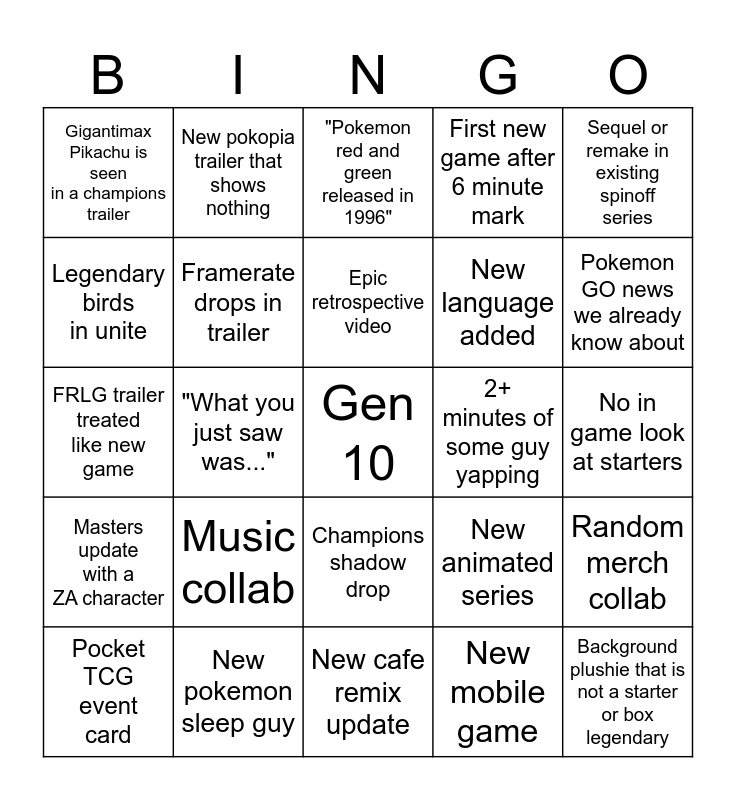 This bingo card has a free space and 24 words: Music collab, New pokemon sleep guy, Epic retrospective video, Pocket TCG event card, Sequel or remake in existing spinoff series, Gigantimax Pikachu is seen in a champions trailer, Legendary birds in unite, New pokopia trailer that shows nothing, 2+ minutes of some guy yapping, Champions shadow drop, New language added, FRLG trailer treated like new game, New animated series, Random merch collab, Framerate drops in trailer, New mobile game, No in game look at starters, "Pokemon red and green released in 1996", Pokemon GO news we already know about, "What you just saw was...", Background plushie that is not a starter or box legendary, Masters update with a ZA character, First new game after 6 minute mark and New cafe remix update.