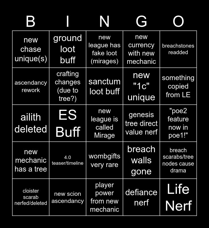 This bingo card has a free space and 24 words: 4.0 teaser/timeline, new scion ascendancy, sanctum loot buff, cloister scarab nerfed/deleted, breachstones readded, new chase unique(s), ascendancy rework, ground loot buff, genesis tree direct value nerf, wombgifts very rare, new "1c" unique, ailith deleted, breach walls gone, breach scarabs/tree nodes cause drama, crafting changes (due to tree?), defiance nerf, "poe2 feature now in poe1!", new league has fake loot (mirages), something copied from LE, ES Buff, Life Nerf, new mechanic has a tree, new currency with new mechanic and player power from new mechanic.