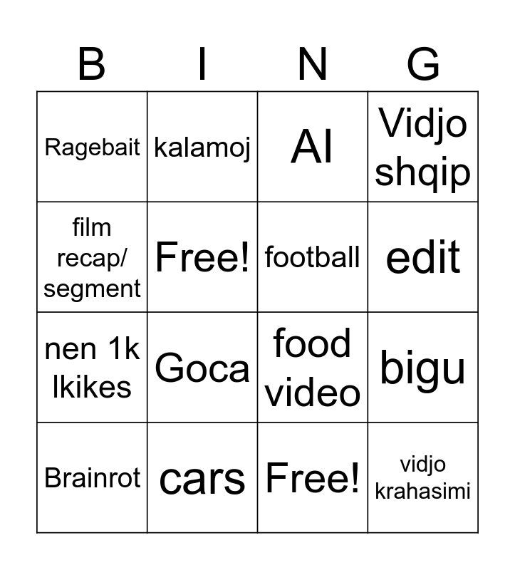 This bingo card has 17 words: Free!, Brainrot, AI, Ragebait, Goca, Vidjo shqip, bigu, football, edit, Free!, cars, food video, film recap/ segment, kalamoj, nen 1k lkikes, meme shqiptare and vidjo krahasimi.