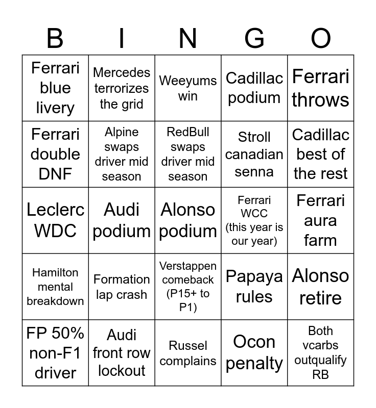 This bingo card has a free space and 24 words: Formation lap crash, Audi front row lockout, RedBull swaps driver mid season, FP 50% non-F1 driver, Ferrari throws, Ferrari blue livery, Ferrari double DNF, Mercedes terrorizes the grid, Ferrari WCC (this year is our year), Verstappen comeback (P15+ to P1), Stroll canadian senna, Leclerc WDC, Papaya rules, Alonso retire, Alpine swaps driver mid season, Ocon penalty, Ferrari aura farm, Weeyums win, Cadillac best of the rest, Audi podium, Both vcarbs outqualify RB, Hamilton mental breakdown, Cadillac podium and Russel complains.