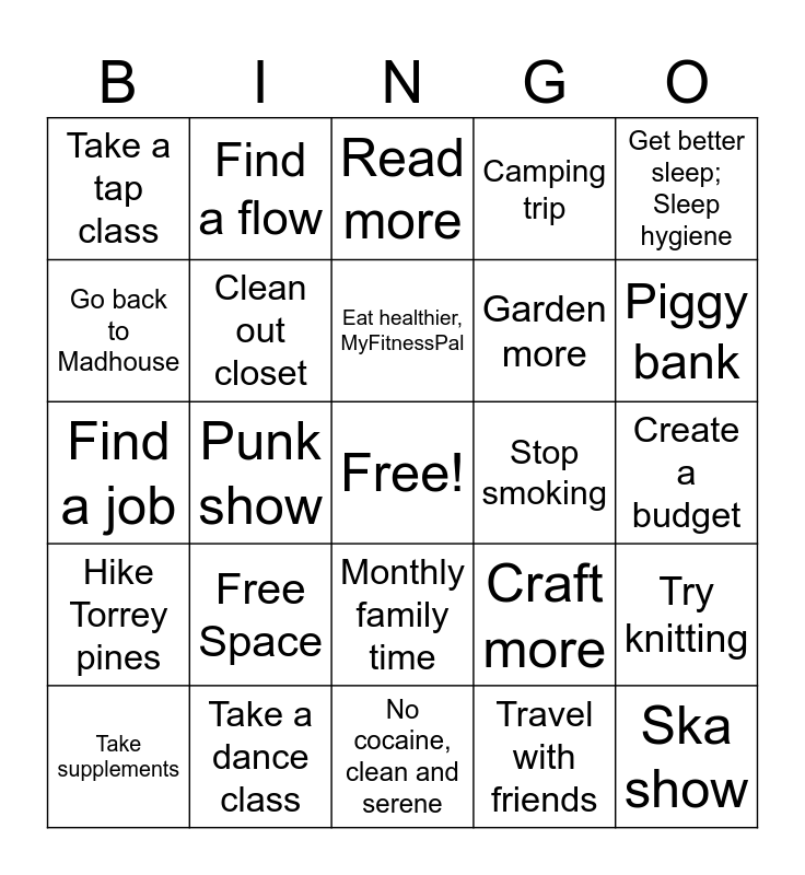This bingo card has a free space and 25 words: Free Space, No cocaine, clean and serene, Eat healthier, MyFitnessPal, Take supplements, Get better sleep; Sleep hygiene, Take a tap class, Go back to Madhouse, Find a flow, Stop smoking, Monthly family time, Garden more, Find a job, Craft more, Try knitting, Clean out closet, Save more money, Create a budget, Read more, Piggy bank, Punk show, Ska show, Take a dance class, Hike Torrey pines, Camping trip and Travel with friends.