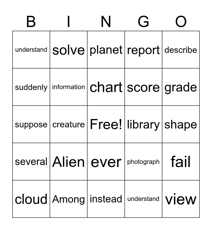This bingo card has a free space and 24 words: Alien, Among, chart, cloud, describe, understand, suddenly, solve, library, ever, score, suppose, photograph, fail, information, understand, shape, planet, grade, creature, view, several, report and instead.