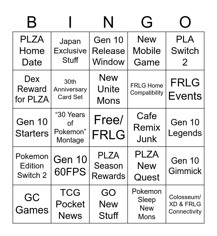 This bingo card has a free space and 24 words: Gen 10 60FPS, TCG Pocket News, New Unite Mons, GC Games, PLA Switch 2, PLZA Home Date, Dex Reward for PLZA, Japan Exclusive Stuff, Cafe Remix Junk, PLZA Season Rewards, FRLG Home Compatibility, Gen 10 Starters, PLZA New Quest, Gen 10 Gimmick, 30th Anniversary Card Set, Pokemon Sleep New Mons, Gen 10 Legends, Gen 10 Release Window, FRLG Events, “30 Years of Pokemon” Montage, Colosseum/ XD & FRLG Connectivity, Pokemon Edition Switch 2, New Mobile Game and GO New Stuff.