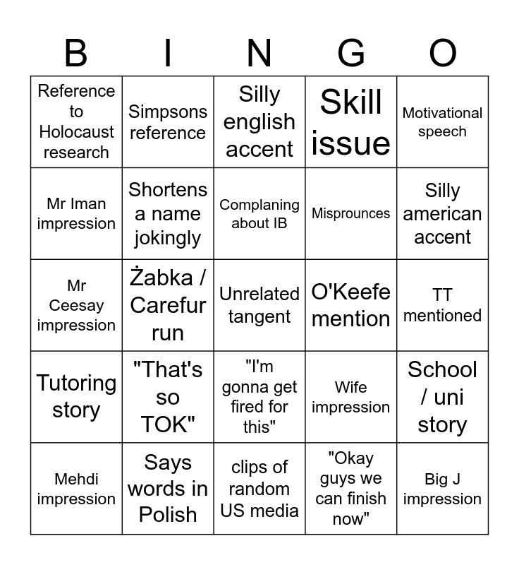 This bingo card has a free space and 24 words: "That's so TOK", Says words in Polish, Complaning about IB, Mehdi impression, Motivational speech, Reference to Holocaust research, Mr Iman impression, Simpsons reference, O'Keefe mention, "I'm gonna get fired for this", Misprounces, Mr Ceesay impression, Wife impression, School / uni story, Shortens a name jokingly, "Okay guys we can finish now", TT mentioned, Silly english accent, Silly american accent, Żabka / Carefur run, Big J impression, Tutoring story, Skill issue and clips of random US media.