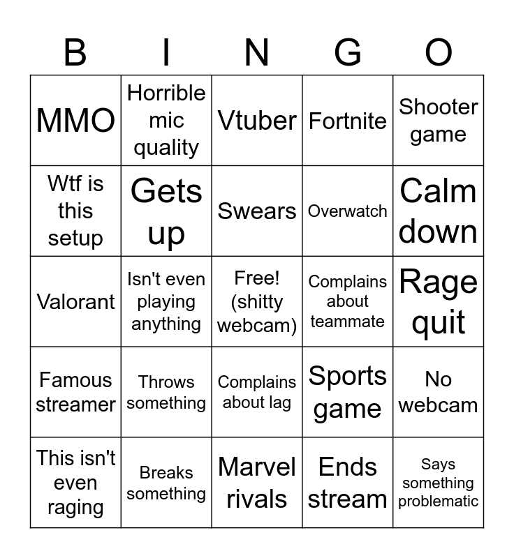 This bingo card has a free space and 24 words: Throws something, Breaks something, Swears, This isn't even raging, Shooter game, MMO, Wtf is this setup, Horrible mic quality, Complains about teammate, Complains about lag, Overwatch, Valorant, Sports game, No webcam, Gets up, Ends stream, Rage quit, Vtuber, Calm down, Isn't even playing anything, Says something problematic, Famous streamer, Fortnite and Marvel rivals.