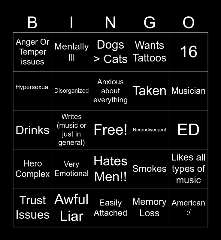 This bingo card has a free space and 24 words: Very Emotional, Awful Liar, Anxious about everything, Trust Issues, 16, Anger Or Temper issues, Hypersexual, Mentally Ill, Neurodivergent, Hates Men!!, Taken, Drinks, Smokes, Likes all types of music, Disorganized, Memory Loss, ED, Dogs > Cats, Musician, Writes (music or just in general), American :/, Hero Complex, Wants Tattoos and Easily Attached.