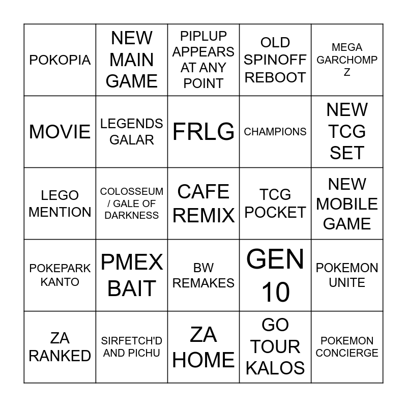 This bingo card has 25 words: PMEX BAIT, ZA HOME, FRLG, ZA RANKED, MEGA GARCHOMP Z, POKOPIA, MOVIE, NEW MAIN GAME, TCG POCKET, BW REMAKES, CHAMPIONS, LEGO MENTION, GEN 10, POKEMON UNITE, LEGENDS GALAR, POKEMON CONCIERGE, NEW MOBILE GAME, PIPLUP APPEARS AT ANY POINT, NEW TCG SET, COLOSSEUM / GALE OF DARKNESS, CAFE REMIX, SIRFETCH'D AND PICHU, POKEPARK KANTO, OLD SPINOFF REBOOT and GO TOUR KALOS.