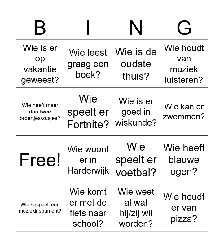 This bingo card has 20 words: Wie heeft blauwe ogen?, Wie heeft er een huisdier thuis?, Wie is de oudste thuis?, Wie komt er uit Zeewolde?, Wie bespeelt een muziekinstrument?, Wie heeft meer dan twee broertjes/zusjes?, Wie komt er met de fiets naar school?, Wie is er op vakantie geweest?, Free!, Wie leest graag een boek?, Wie woont er in Harderwijk, Wie speelt er voetbal?, Wie speelt er Fortnite?, Wie houdt er van pizza?, Wie is er goed in wiskunde?, Wie is er goed in Nederlands?, Wie kan er zwemmen?, Wie houdt van muziek luisteren?, Wie weet al wat hij/zij wil worden? and Wie kent een goede mop?.