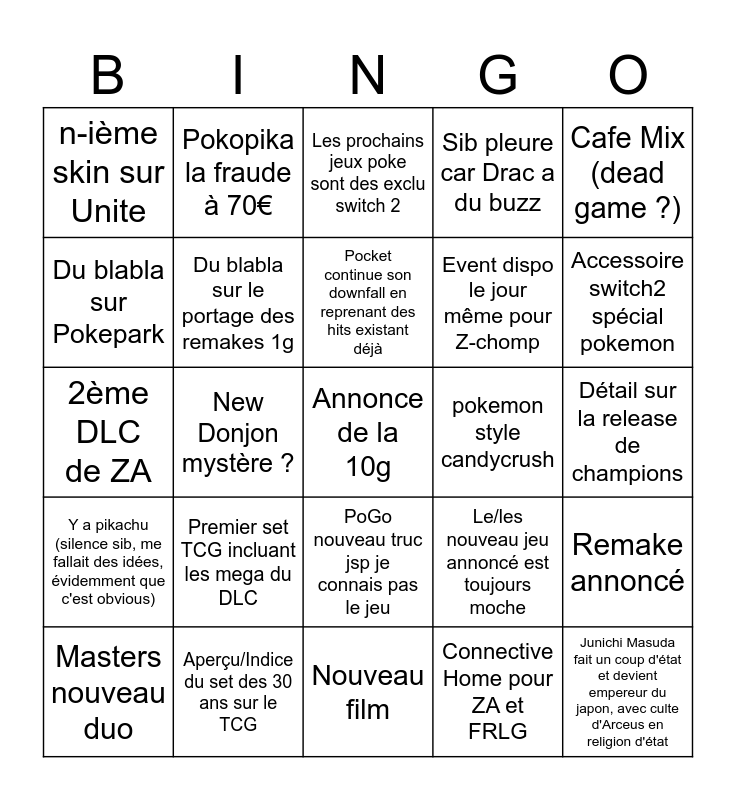 This bingo card has a free space and 24 words: Premier set TCG incluant les mega du DLC, Aperçu/Indice du set des 30 ans sur le TCG, Pocket continue son downfall en reprenant des hits existant déjà, Masters nouveau duo, Cafe Mix (dead game ?), n-ième skin sur Unite, Du blabla sur Pokepark, Pokopika la fraude à 70€, pokemon style candycrush, PoGo nouveau truc jsp je connais pas le jeu, Event dispo le jour même pour Z-chomp, 2ème DLC de ZA, Le/les nouveau jeu annoncé est toujours moche, Remake annoncé, Du blabla sur le portage des remakes 1g, Connective Home pour ZA et FRLG, Détail sur la release de champions, Les prochains jeux poke sont des exclu switch 2, Accessoire switch2 spécial pokemon, New Donjon mystère ?, Junichi Masuda fait un coup d'état et devient empereur du japon, avec culte d'Arceus en religion d'état, Y a pikachu (silence sib, me fallait des idées, évidemment que c'est obvious), Sib pleure car Drac a du buzz and Nouveau film.