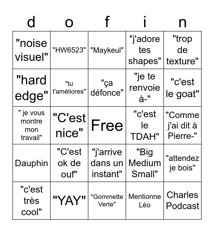 This bingo card has a free space and 24 words: "C'est ok de ouf", "YAY", "ça défonce", "c'est très cool", "trop de texture", "noise visuel", "hard edge", "HW6523", "c'est le TDAH", "j'arrive dans un instant", "je te renvoie à-", " je vous montre mon travail", "Big Medium Small", "attendez je bois", "tu t'améliores", Mentionne Léo, "Comme j'ai dit à Pierre-", "Maykeul", "c'est le goat", "C'est nice", Charles Podcast, Dauphin, "j'adore tes shapes" and "Gommette Verte".