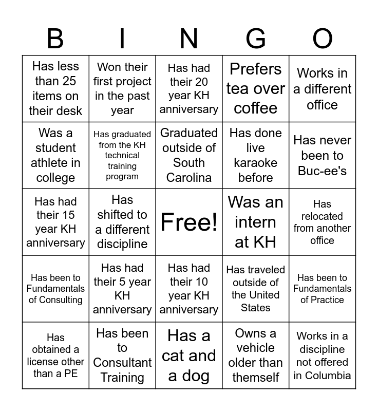 This bingo card has a free space and 24 words: Has had their 5 year KH anniversary, Has been to Consultant Training, Graduated outside of South Carolina, Has obtained a license other than a PE, Works in a different office, Has less than 25 items on their desk, Was a student athlete in college, Won their first project in the past year, Was an intern at KH, Has had their 10 year KH anniversary, Has done live karaoke before, Has had their 15 year KH anniversary, Has traveled outside of the United States, Has been to Fundamentals of Practice, Has graduated from the KH technical training program, Owns a vehicle older than themself, Has relocated from another office, Has had their 20 year KH anniversary, Has never been to Buc-ee's, Has shifted to a different discipline, Works in a discipline not offered in Columbia, Has been to Fundamentals of Consulting, Prefers tea over coffee and Has a cat and a dog.