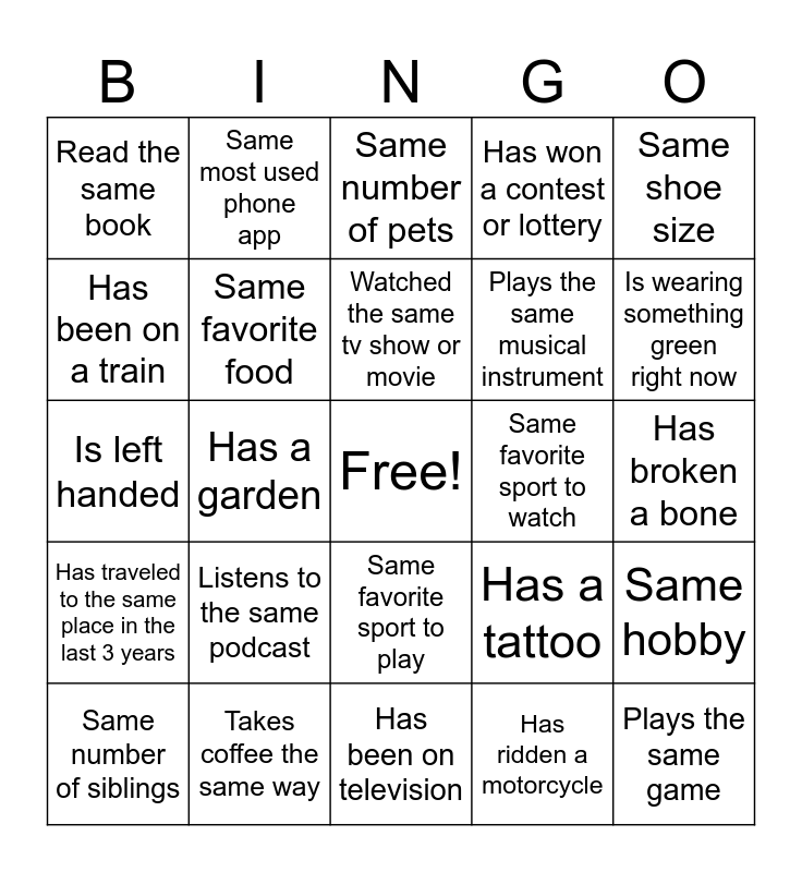 This bingo card has a free space and 24 words: Listens to the same podcast, Takes coffee the same way, Watched the same tv show or movie, Same number of siblings, Same shoe size, Read the same book, Has been on a train, Same most used phone app, Same favorite sport to watch, Same favorite sport to play, Plays the same musical instrument, Is left handed, Has a tattoo, Same hobby, Same favorite food, Has ridden a motorcycle, Has broken a bone, Same number of pets, Is wearing something green right now, Has a garden, Plays the same game, Has traveled to the same place in the last 3 years, Has won a contest or lottery and Has been on television.