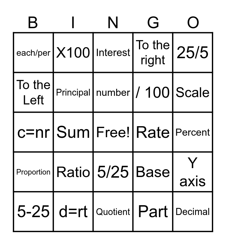 This bingo card has a free space and 31 words: Quotient, Product, Sum, Difference, each/per, Interest, Principal, Base, Rate, Part, Percent, Decimal, Mixed #, Improper Fraction, Scale, X axis, Y axis, Ratio, Proportion, 5/25, 25/5, 25-5, 5-25, X100, / 100, To the Left, To the right, c=nr, d=rt, number and cost.