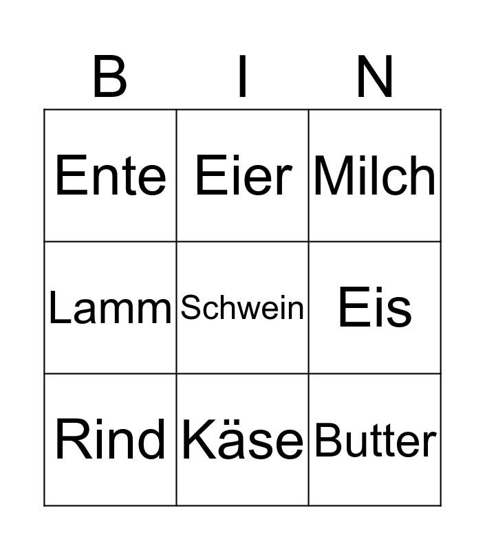 This bingo card has 9 words: Rind, Milch, Eier, Lamm, Ente, Eis, Schwein, Butter and Käse.