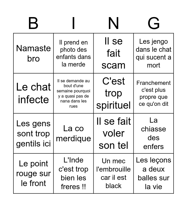 This bingo card has 16 words: L'Inde c'est trop bien les freres !!, La chiasse des enfers, Il se fait scam, Namaste bro, Les gens sont trop gentils ici, Il prend en photo des enfants dans la merde, Il se fait voler son tel, Un mec l'embrouille car il est black, Le chat infecte, Il se demande au bout d'une semaine pourquoi y a quasi pas de nana dans les rues, Le point rouge sur le front, Les jengo dans le chat qui sucent a mort, La co merdique, Franchement c'est plus propre que ce qu'on dit, C'est trop spirituel and Les leçons a deux balles sur la vie.