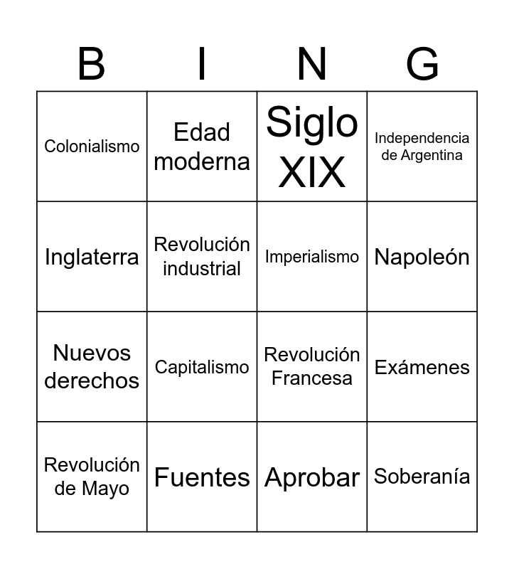 This bingo card has 16 words: Revolución de Mayo, Fuentes, Siglo XIX, Independencia de Argentina, Inglaterra, Edad moderna, Revolución Francesa, Exámenes, Colonialismo, Revolución industrial, Aprobar, Napoleón, Nuevos derechos, Capitalismo, Imperialismo and Soberanía.