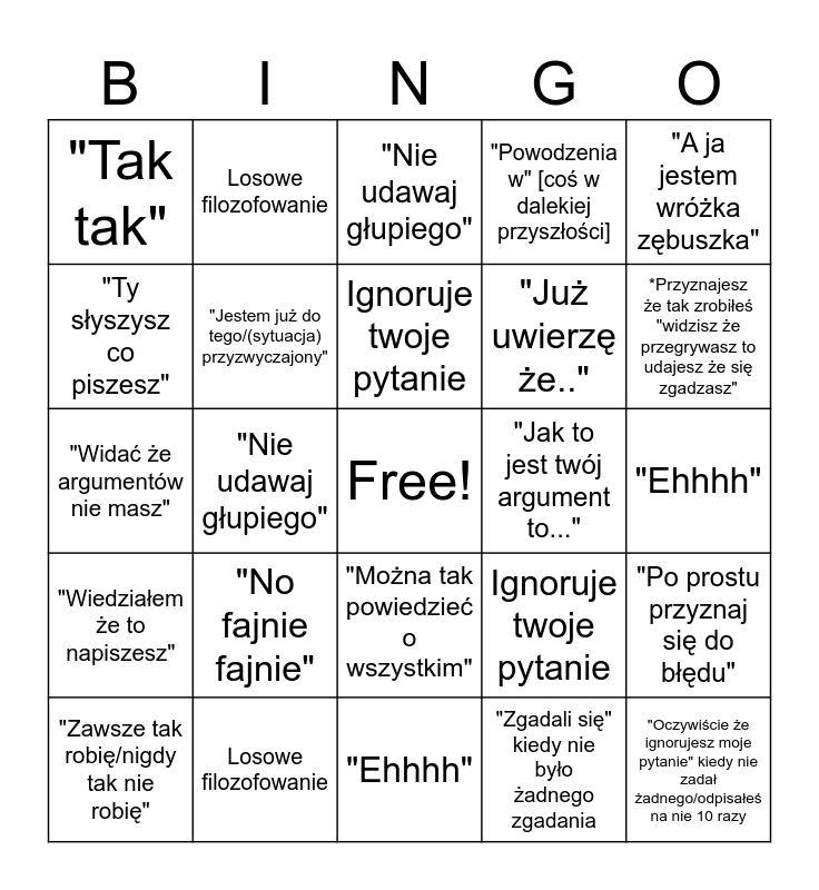 This bingo card has a free space and 64 words: "Widać że argumentów nie masz", "Jak to jest twój argument to...", *Wychodzisz na 2s "oczywiście że ucieka jak nie ma argumentów", "Po prostu przyznaj się do błędu", "Pokazujesz teraz jaki jesteś....", "Oczywiście że ignorujesz moje pytanie" kiedy odpisałeś na nie 10 razy, Losowe filozofowanie, Najgorszy przykład w historii człowieka, Ignoruje twoje pytanie, Dawanie losowego wyniku jakiegoś argumentu, "Można tak powiedzieć o wszystkim", "Ty sb słyszysz", "Ehhhh", "A ja jestem wróżka zębuszka", "Japidi", "Ty słyszysz co piszesz", "Nie udawaj głupiego", "Tak tak", Wyzywanie nie wprost (np. "każdy normalny człowiek.."), "Już uwierzę że..", "No fajnie fajnie", "Wiedziałem że to napiszesz", "Powodzenia w" [coś w dalekiej przyszłości], "wy" mówiąc o jednej osobie, "Marceli/Bartek tak mówi" kiedy ta osoba nic nie pisze, "Przecież to oczywiste że każdy..", "Niezły argument", "Jak ty tak nie robisz to źle", "Jeśli chcesz żebym [coś zrobił] to spk", "Ja tak nie robię tylko ty tak robisz", "Jaki to ma sens?", *Napisał wiadomość raz, "napisałem ci to X razy (X>10), "To nie _ , to głupota", "Nie zmieniaj tematu bo przegrywasz", *Przyznajesz że tak zrobiłeś "widzisz że przegrywasz to udajesz że się zgadzasz", "Zawsze tak robię/nigdy tak nie robię", "Udowadniasz jak nisko można upaść", "Zgadali się" kiedy nie było żadnego zgadania, "Podaj mi jeden powód/przykład", "Jestem już do tego/(sytuacja) przyzwyczajony", "Widać że argumentów nie masz", "Jak to jest twój argument to...", 3. *Wychodzisz na 2 sekundy "oczywiście że uciekają jak nie mają argumentów", "Po prostu przyznaj się do błędu", "Pokazujesz teraz jaki jesteś....", "Oczywiście że ignorujesz moje pytanie" kiedy nie zadał żadnego/odpisałeś na nie 10 razy, Losowe filozofowanie, Najgorszy przykład w historii człowieka, Ignoruje twoje pytanie, Dawanie losowego wyniku jakiegoś argumentu, "Można tak powiedzieć o wszystkim", "Ty sb słyszysz", "Ehhhh", "A ja jestem wróżka zębuszka", "Japidi", "Ty słyszysz co piszesz", "Nie udawaj głupiego", "Tak tak", Wyzywanie nie wprost (np. "każdy normalny człowiek.."), "Już uwierzę że..", "No fajnie fajnie", "Wiedziałem że to napiszesz", "Powodzenia w" [coś w dalekiej przyszłości] and Mówi "wy" mówiąc o jednej osobie.