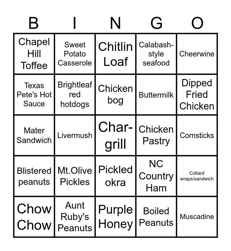 This bingo card has 58 words: Free!, Aunt Ruby's Peanuts, Biscuitville, Blistered peanuts, Boiled Peanuts, Bojangles, Brightleaf red hotdogs, Brunswick stew, Buttermilk, Cackalacky sauce, Calabash-style seafood, Carolina Packers, Carolina style burger/hotdogs, Carolina Treet Bbq sauce, Caviar of the south, Chapel Hill Toffee, Char-grill, Cheerwine, Cheese straws, Chicken bog, Chicken Pastry, Chitlin Loaf, Chow Chow, Collard wraps/sandwich, Cook-out, Cornsticks, Country Ham Biscuits, Deviled eggs, Dipped Fried Chicken, Eastern NC BBQ, Fried green tomatoes, Ground Steak Sandwich, Hardee's, Hushpuppies, Krispy Kreme, Lance crackers, Lexington-style BBQ, Livermush, Mater Sandwich, Moravian cookies, Mt.Olive Pickles, Muscadine, NC Country Ham, Neese's sausage, Pecans, Pepper jelly, Pepsi/Brad's Drink, Pickled okra, Purple Honey, Red Slaw, Scuppernong Grape Hull Pie, Sonker, Southern supreme fruit cake, Sun drop, Sweet Potato Casserole, Sweet Potato Pie, Texas Pete's Hot Sauce and Tom Thumb.