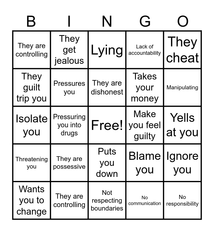 This bingo card has a free space and 24 words: They are possessive, They are controlling, They are dishonest, Wants you to change, They cheat, They are controlling, They guilt trip you, They get jealous, Make you feel guilty, Puts you down, Takes your money, Isolate you, Blame you, Ignore you, Pressures you, No communication, Yells at you, Lying, Manipulating, Pressuring you into drugs, No responsibility, Threatening you, Lack of accountability and Not respecting boundaries.