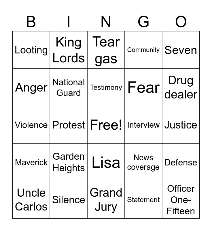 This bingo card has a free space and 31 words: Grand Jury, Indictment, Protest, Riot, Looting, Tear gas, National Guard, News coverage, Interview, Statement, Justice, Officer One-Fifteen, Unarmed, Media, Drug dealer, Reputation, Defense, Garden Heights, Maverick, Lisa, Seven, DeVante, Uncle Carlos, King Lords, Fear, Anger, Community, Violence, Silence, Testimony and Decision.