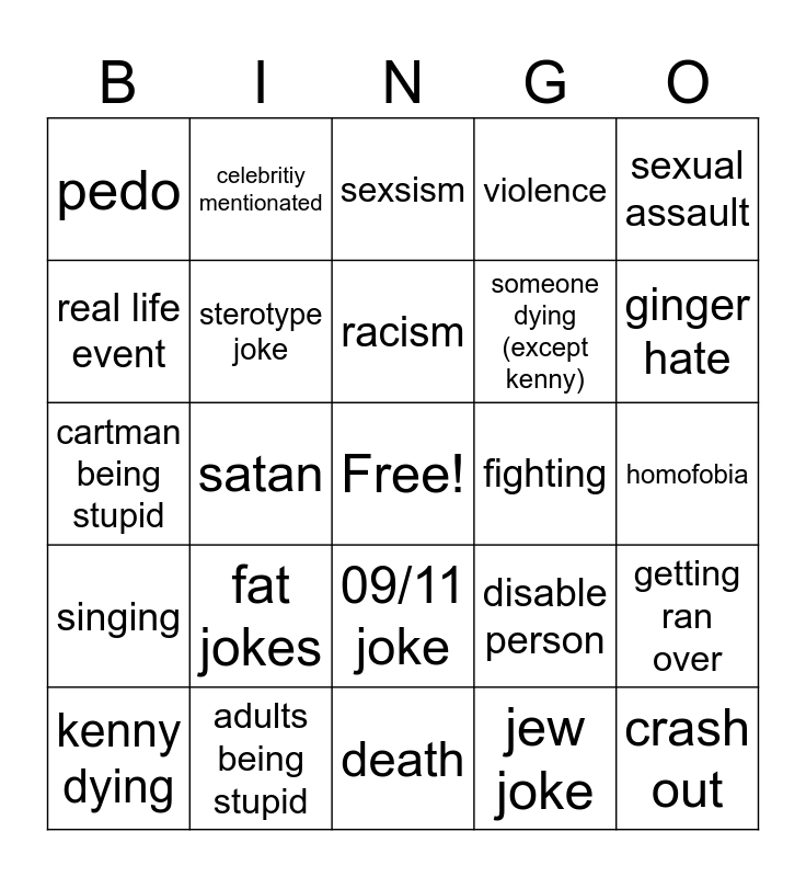This bingo card has a free space and 24 words: kenny dying, fat jokes, racism, jew joke, sexual assault, pedo, celebritiy mentionated, sexsism, fighting, homofobia, cartman being stupid, sterotype joke, disable person, getting ran over, real life event, adults being stupid, death, violence, ginger hate, singing, satan, 09/11 joke, someone dying (except kenny) and crash out.