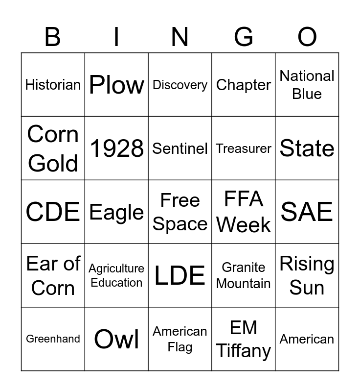 This bingo card has a free space and 24 words: Agriculture Education, Owl, Sentinel, Greenhand, National Blue, Historian, Corn Gold, Plow, FFA Week, LDE, Treasurer, CDE, Granite Mountain, Rising Sun, 1928, EM Tiffany, SAE, Discovery, State, Eagle, American, Ear of Corn, Chapter and American Flag.