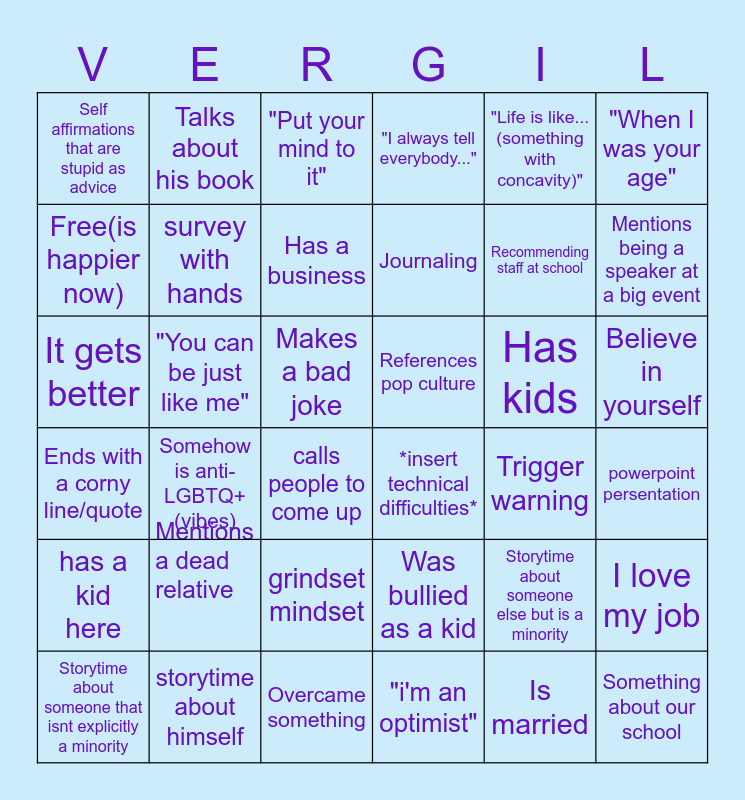 This bingo card has 36 words: Ends with a corny line/quote, Somehow is anti-LGBTQ+(vibes), Overcame something, Journaling, Has kids, Believe in yourself, Self affirmations that are stupid as advice, storytime about himself, "Put your mind to it", Was bullied as a kid, Recommending staff at school, "When I was your age", has a kid here, "You can be just like me", Has a business, "I always tell everybody...", Storytime about someone else but is a minority, powerpoint persentation, Free(is happier now), survey with hands, calls people to come up, *insert technical difficulties*, Trigger warning, I love my job, It gets better, Talks about his book, Makes a bad joke, "i'm an optimist", "Life is like...(something with concavity)", Mentions being a speaker at a big event, Storytime about someone that isnt explicitly a minority, Mentions a dead relative, grindset mindset, References pop culture, Is married and Something about our school.