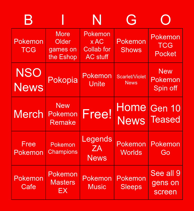 This bingo card has a free space and 24 words: Pokemon Champions, Pokemon Masters EX, Pokemon Unite, Pokemon Cafe, Pokemon TCG Pocket, Pokemon TCG, NSO News, More Older games on the Eshop, Home News, Legends ZA News, Scarlet/Violet News, Merch, Pokemon Worlds, Pokemon Go, Pokopia, Pokemon Sleeps, Gen 10 Teased, Pokemon x AC Collab for AC stuff, New Pokemon Spin off, New Pokemon Remake, See all 9 gens on screen, Free Pokemon, Pokemon Shows and Pokemon Music.