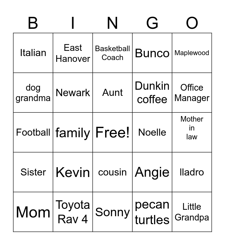 This bingo card has a free space and 34 words: Brianna, pecan turtles, Cleaning, figs, Sister, Newark, Maplewood, Mom, East Hanover, Milkyway, Aunt, Basketball Coach, Riley, I.H.M., Noelle, Office Manager, Toyota Rav 4, Football, Kevin, Angie, cousin, Matthew, Italian, Mother in law, Sonny, Little Grandpa, Bunco, Reservoir, Dunkin coffee, dog grandma, GOAT, family, lladro and friend.