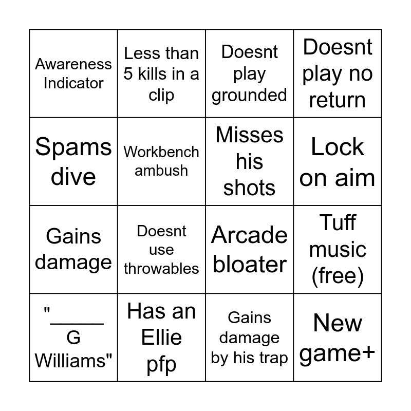This bingo card has 16 words: Has an Ellie pfp, Tuff music (free), Doesnt play grounded, Awareness Indicator, Gains damage, Less than 5 kills in a clip, Arcade bloater, Gains damage by his trap, Spams dive, Workbench ambush, "_____ G Williams", Doesnt play no return, Doesnt use throwables, Lock on aim, Misses his shots and New game+.