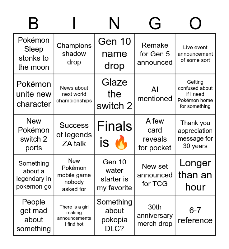 This bingo card has a free space and 24 words: New Pokémon mobile game nobody asked for, There is a girl making announcements I find hot, Glaze the switch 2, People get mad about something, Live event announcement of some sort, Pokémon Sleep stonks to the moon, Pokémon unite new character, Champions shadow drop, A few card reveals for pocket, Gen 10 water starter is my favorite, AI mentioned, New Pokémon switch 2 ports, New set announced for TCG, Longer than an hour, News about next world championships, 30th anniversary merch drop, Thank you appreciation message for 30 years, Gen 10 name drop, Getting confused about if I need Pokémon home for something, Success of legends ZA talk, 6-7 reference, Something about a legendary in pokemon go, Remake for Gen 5 announced and Something about pokopia DLC?.