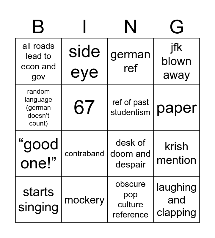 This bingo card has 17 words: obscure pop culture reference, starts singing, german ref, all roads lead to econ and gov, contraband, jfk blown away, krish mention, ref of past studentism, paper, 67, mockery, desk of doom and despair, random language (german doesn’t count), side eye, “good one!”, sports ! and laughing and clapping.