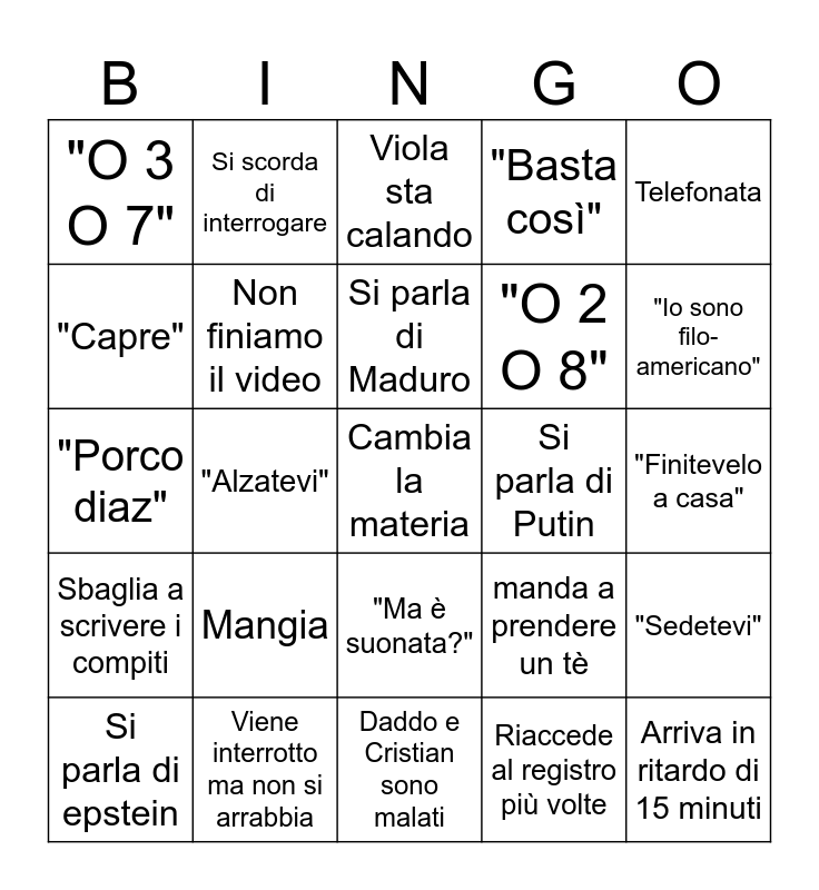 This bingo card has 53 words: Divaga, Cambia la materia, Si lamenta della scuola, Riaccede al registro più volte, Mangia, Interroga anche se non doveva, Si scorda di interrogare, "Pompa", "Capre", Bipolarismo, Non finiamo il video, Video, "Sedetevi", manda a prendere un tè, Chiede aiuto per il pc/la lim, Si parla di epstein, Si parla di Maduro, Si parla di Putin, Va fuori dall'aula e torna dopo 20 minuti, Telefonata, "Alzatevi", Arriva in ritardo di 15 minuti, "O 2 O 8", "O 3 O 7", Spiegazione effettivamente interessante, Viene interrotto ma non si arrabbia, Sbaglia registro, "Dove siamo arrivati?", "Va' l'audio?, "Io sono filo-americano", "Sono di centro-destra", "Fissatevi le date", Mette 9 a caso, Mette 2 a caso, "Non scrivete", "State scrivendo?", "Basta così", Daddo e Cristian sono malati, Viola sta calando, Non può interrogare Sofia, "Si vede la mappa?", Libro ellettronico, "Finitevelo a casa", "Voglio sapere tutto", "Non voglio sapere tutto", "Ma è suonata?", "Quante ore abbiamo?", "Abbiamo due ore?", "Porco diaz", Sbaglia a scrivere i compiti, Sbatte la cattedra, Dice qualcosa che conosce solo lui and Si inventa una storia assurda.