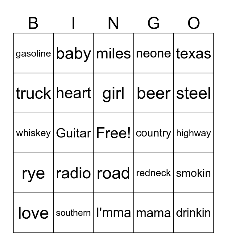 This bingo card has a free space and 24 words: radio, southern, girl, love, texas, gasoline, truck, baby, country, road, beer, whiskey, redneck, smokin, heart, mama, highway, miles, steel, Guitar, drinkin, rye, neone and I'mma.