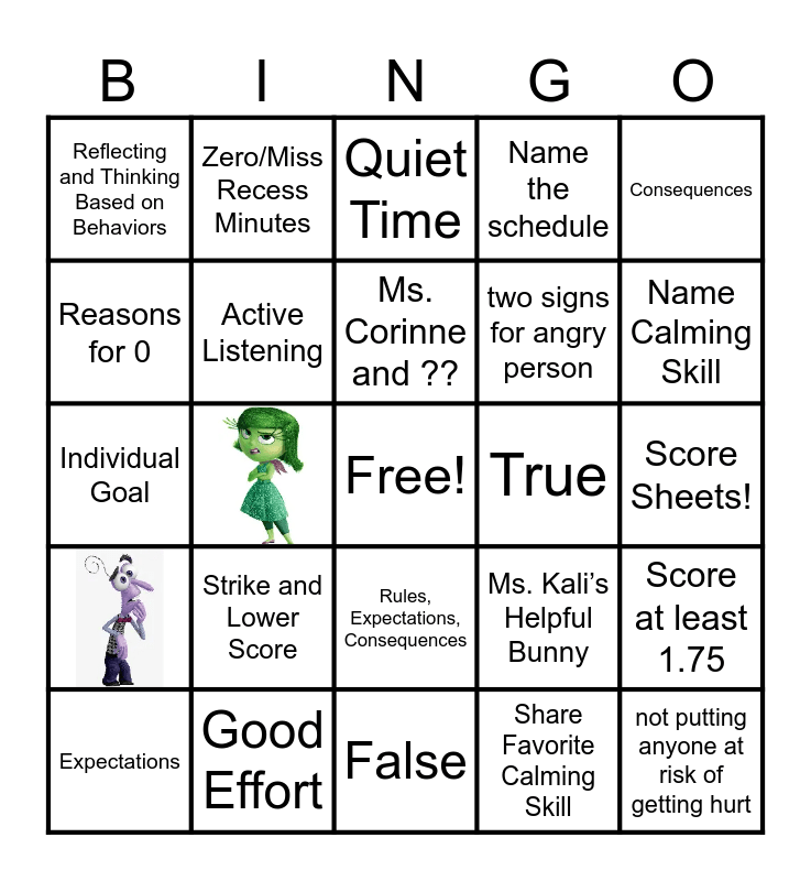 This bingo card has 5 images, a free space and 28 words: Active Listening, Consequences, Expectations, Zero/Miss Recess Minutes, Ms. Kali and ??, Ms. Corinne and ??, Quiet Time, Calm Body, Follow Schedule, True, Name Calming Skill, Good Effort, Individual Goal, Strike and Lower Score, Ms. Kali’s Helpful Bunny, Rules, Expectations, Consequences, Following Rules/Positive Behaviors, Reflecting and Thinking Based on Behaviors, Score Sheets!, False, not putting anyone at risk of getting hurt, Name the schedule, two signs for angry person, Reasons for 0, Score at least 1.75, Share Favorite Fidget, Share Favorite Calming Skill and How are you feeling right now?.