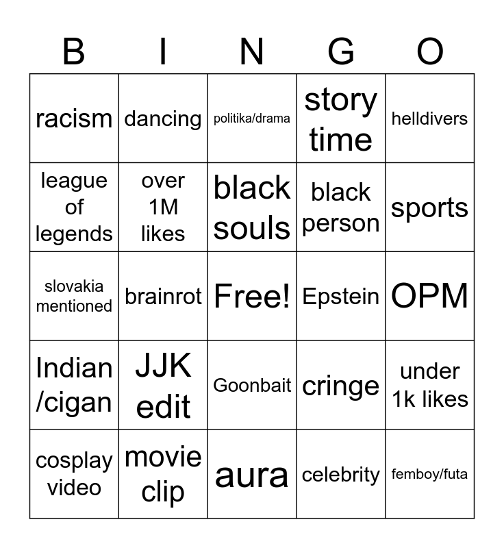 This bingo card has a free space and 24 words: JJK edit, movie clip, black souls, cosplay video, helldivers, racism, league of legends, dancing, Epstein, Goonbait, black person, slovakia mentioned, cringe, under 1k likes, over 1M likes, celebrity, OPM, politika/drama, sports, brainrot, femboy/futa, Indian /cigan, story time and aura.